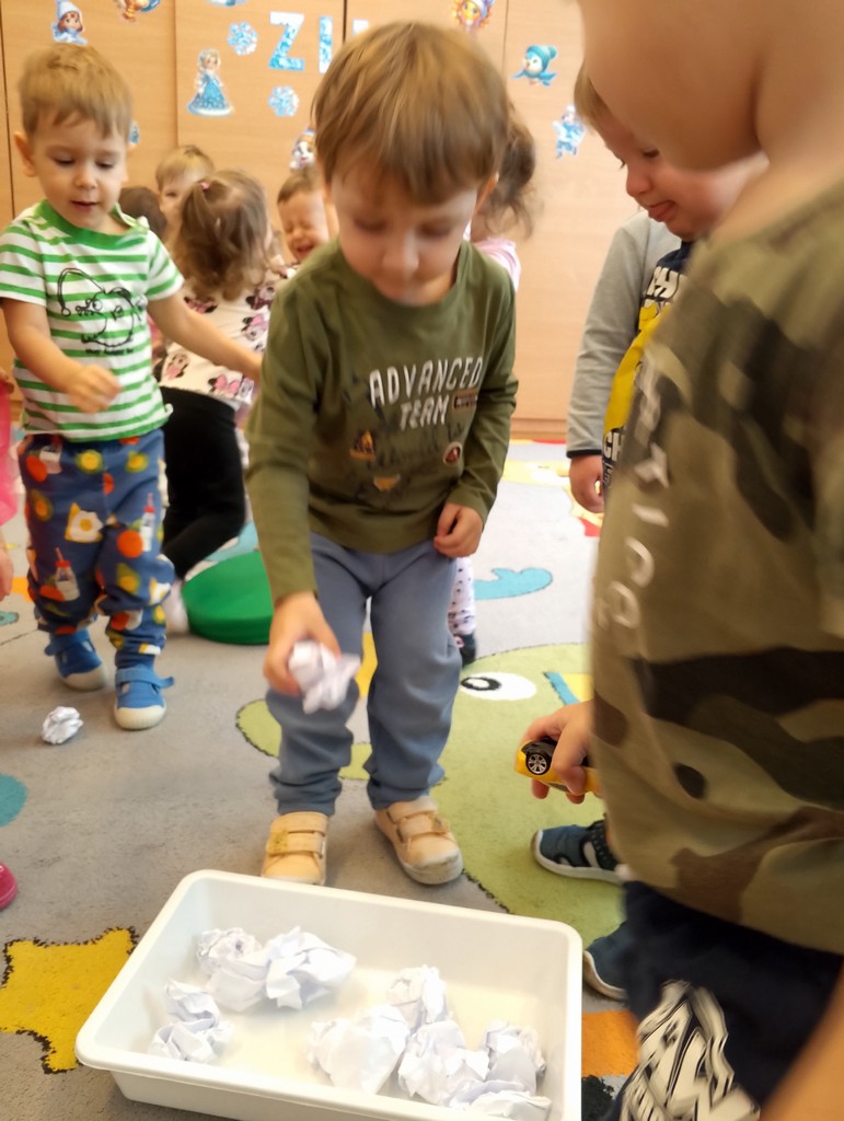 Podczas ostatnich zajęć nasze Motylki uprawniały motorykę dużą i małą. Panie zaproponowały dzieciom pląsanie w rytm muzyki po kartkach papieru ułożonych na dywanie. Maluszki maszerowały, skakały, stały na jednej nodze. W dalszej części zajęć dzieci ćwiczyły swoje małe rączki robiąc z papieru kulki i trafiając nimi do pojemnika. Jednak największą frajdę miały robiąc z papieru śnieg, rozrywając go na malutkie kawałeczki. Były to bardzo kreatywne i napewno wesołe zabawy.