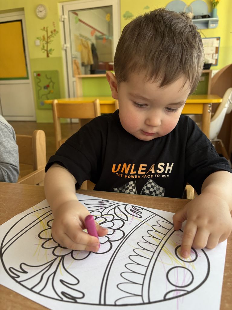 Żłobkowicze z grupy „Motylki” w czasie zajęć plastycznych ozdabiali wielkanocne pisanki. Swoje prace wykonywali metodą wyklejania, z wykorzystaniem naturalnych materiałów jak różnobarwne listki czy gałązki tuji. Zajęcia takie doskonale stymulują rozwój kreatywności oraz korzystnie wływają na rozwój sensoryczny, motoryczny i poznawczy małego dziecka. Kolorowe, pięknie ozdobionie jajka wielkanocne wraz ze świątecznymi życzeniami dzieci zabrały do swoich domów.
