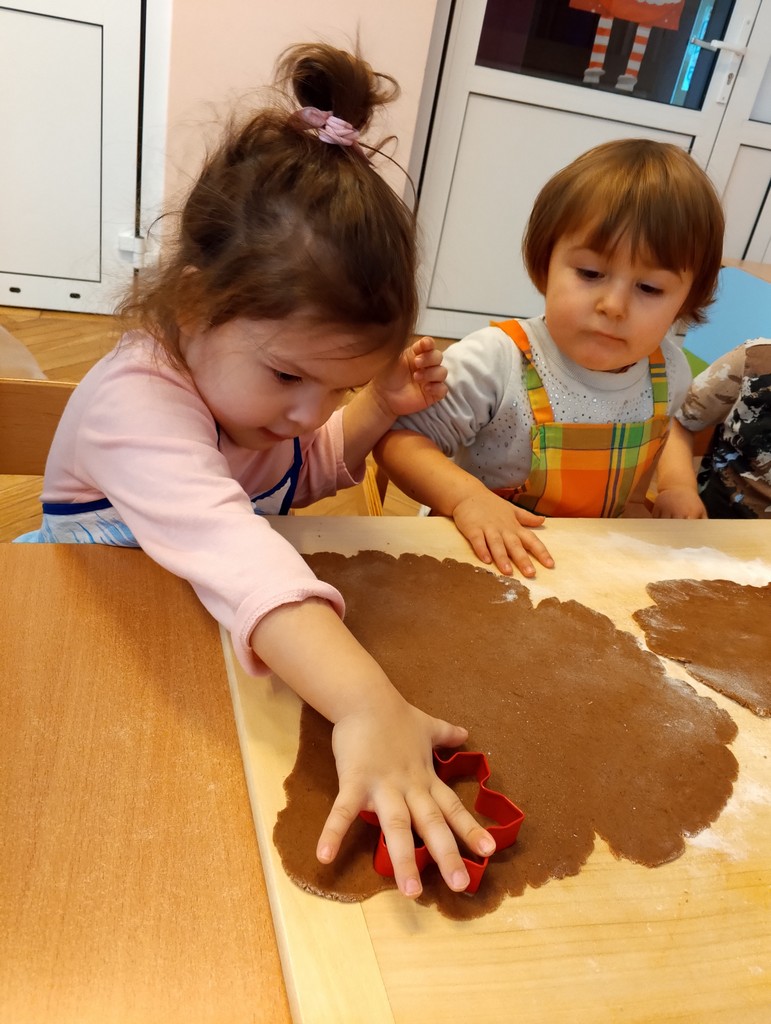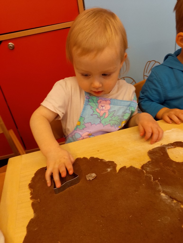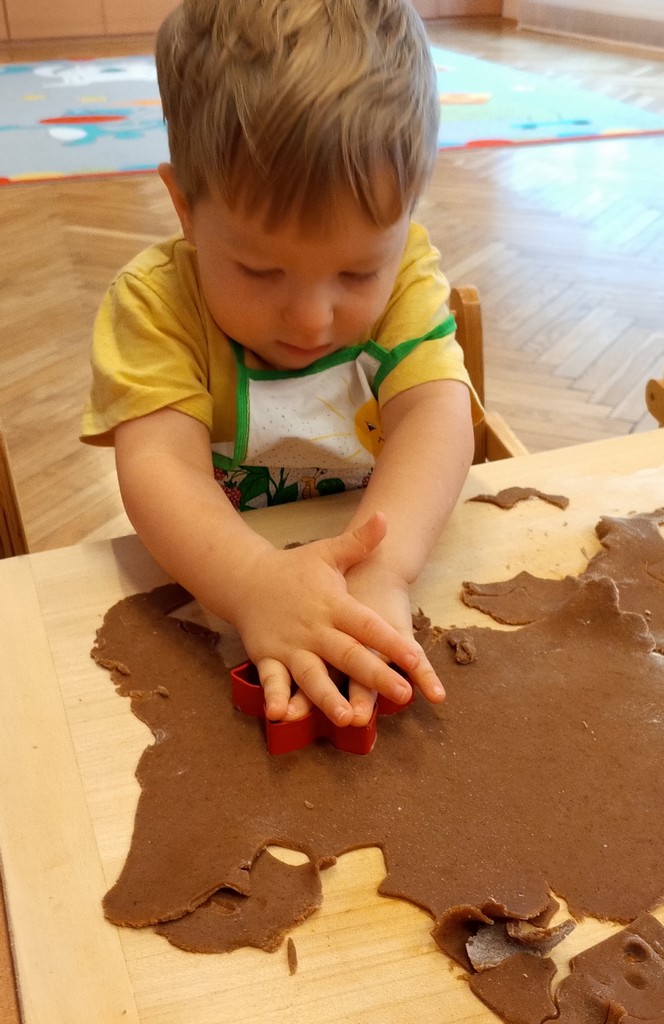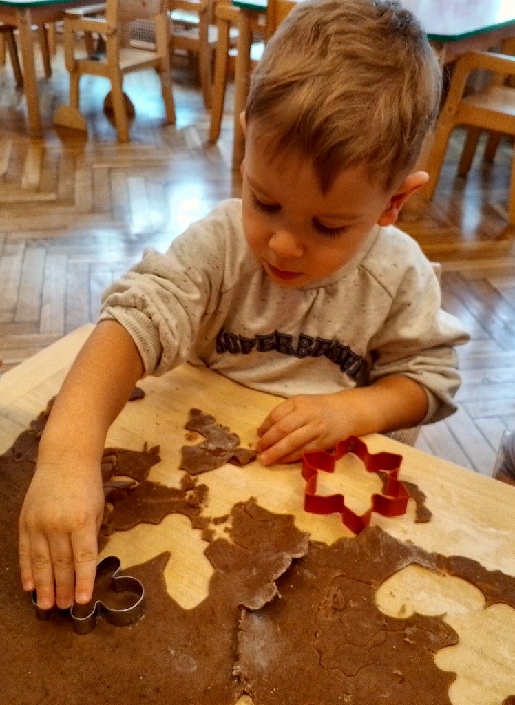 Maluszki bardzo chętnie wałkowały ciasto, wycinały pierniki i układały je na blasze. Były to bardzo kreatywne zajęcia. Wszystkie dzieci były niesamowicie szczęśliwe. Swoje wypieki zjadły że smakiem na podwieczorek.