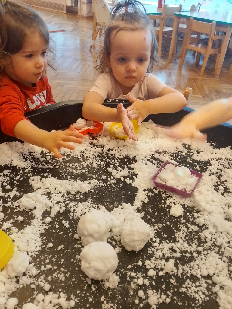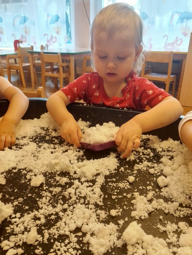 Brakuje mam go za oknem dlatego Panie przygotowały dzieciom sztuczny śnieg z mąki ziemniaczanej. Nasi Milusińscy mieli świetna zabawę, rozbudzającą wyobraźnię i zmysły.