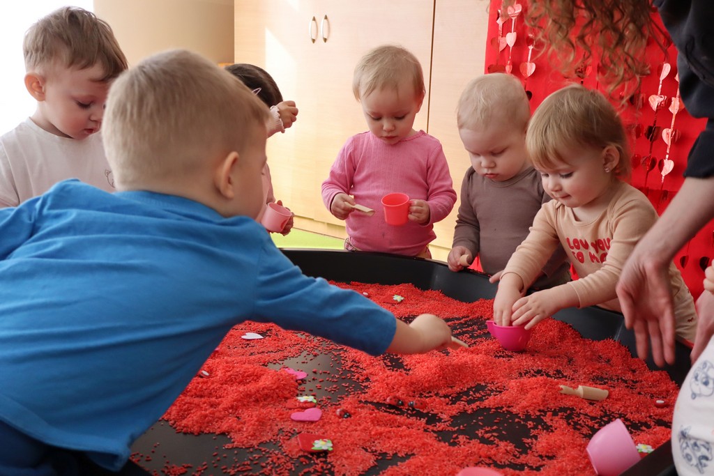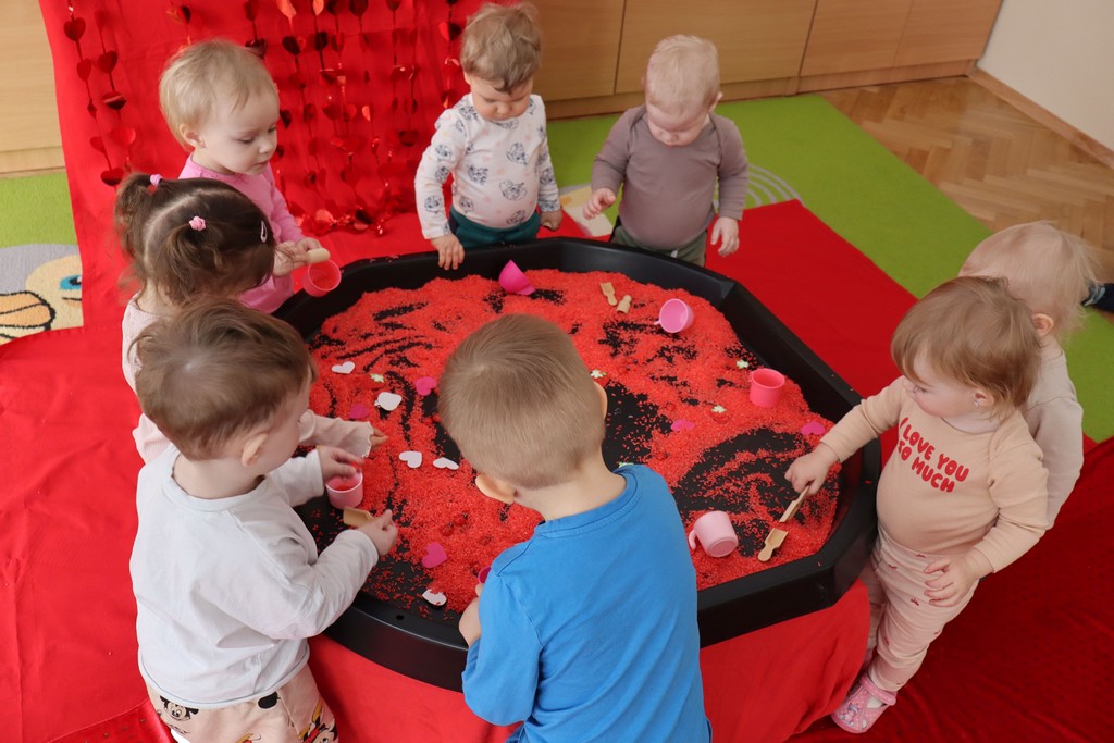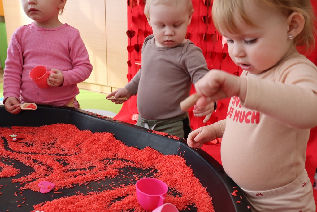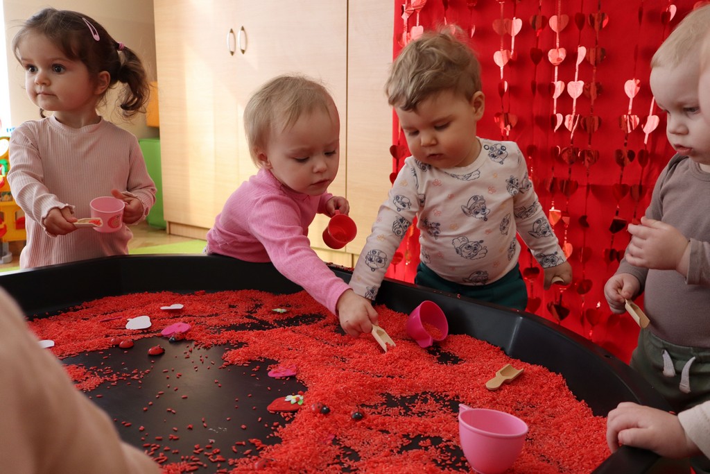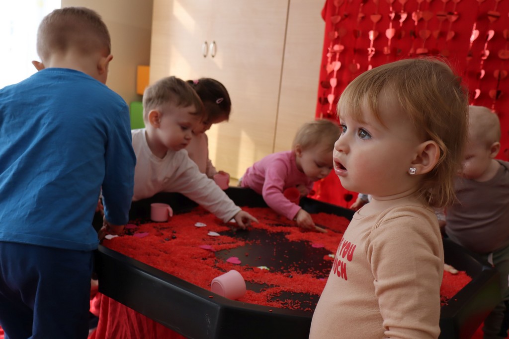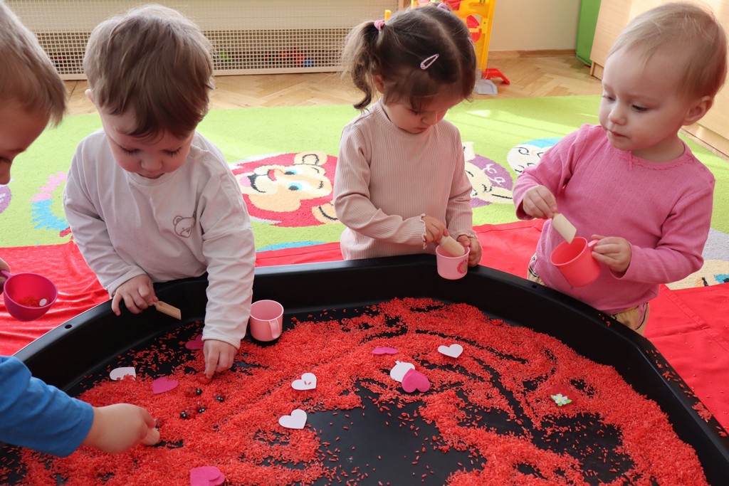 Dzieci z grupy Pszczółki ze Żłobka nr 1 obchodziły je 14 lutego. Z ogromnycm zaangażowaniem szukały serduszek ukrytych w czerwonym ryżu, naklejały serduszkowe naklejki na wycięte z papieru serca. Najbardziej podobało się dzieciom rysowanie paluszkami w ryżu wysypanym na podświetlone pudełka.