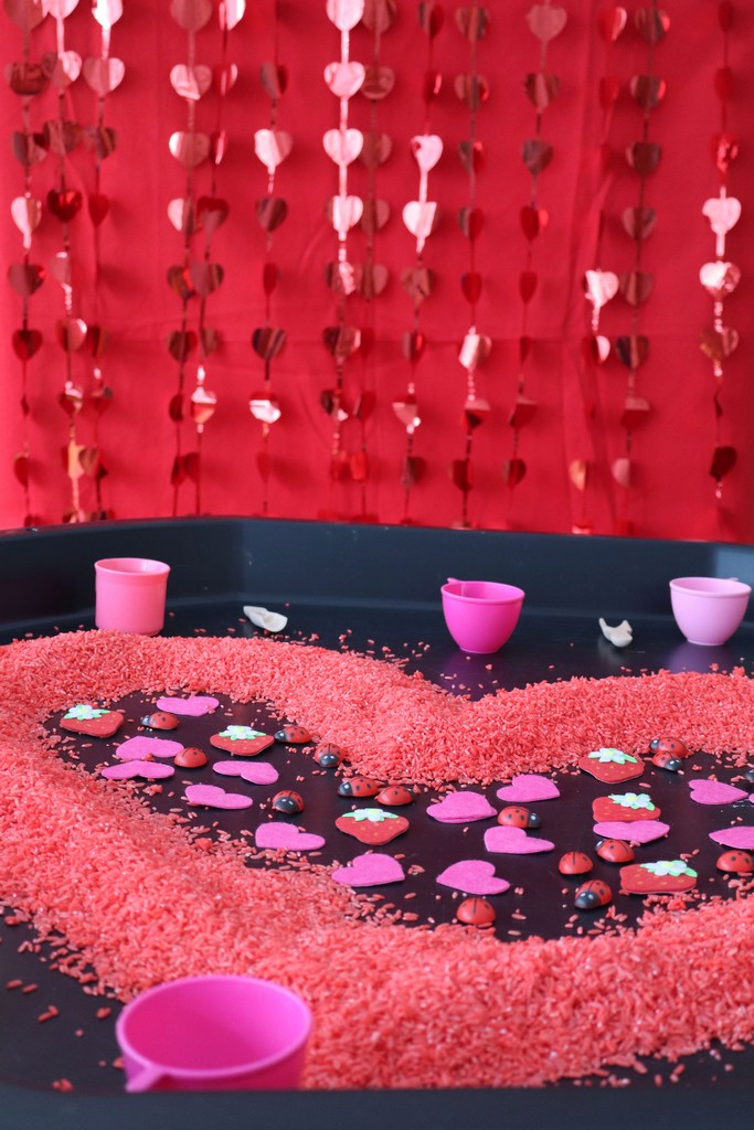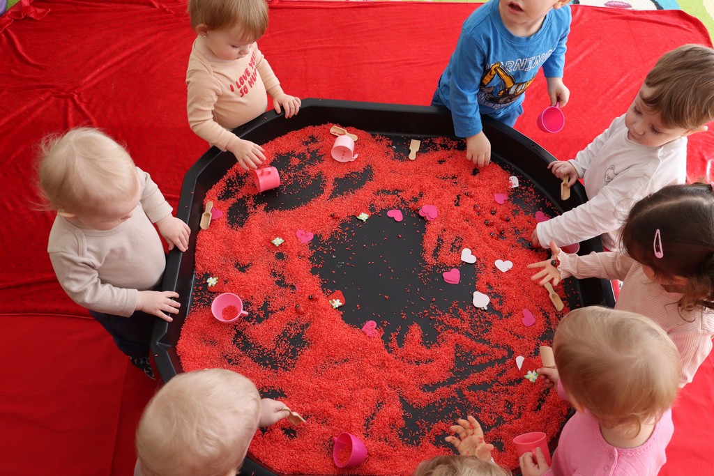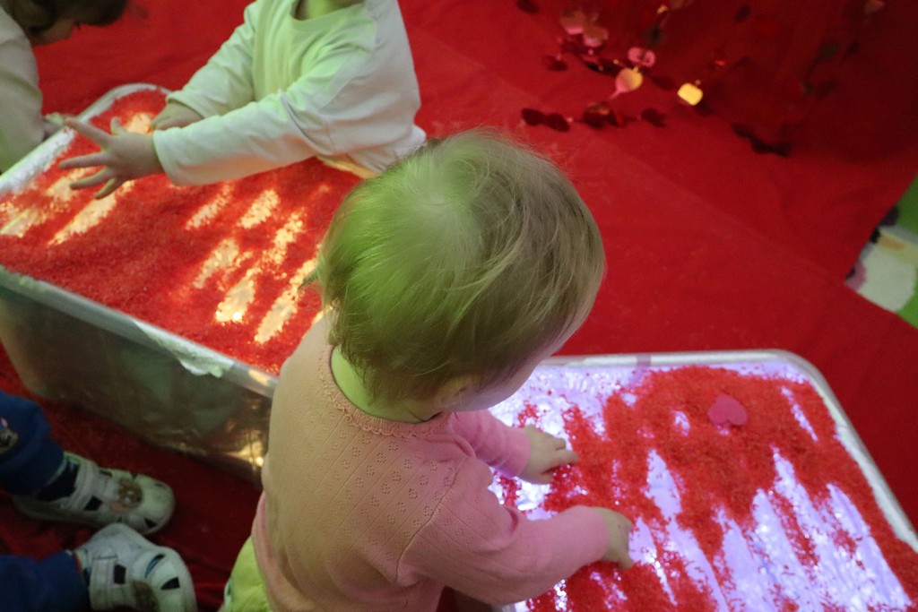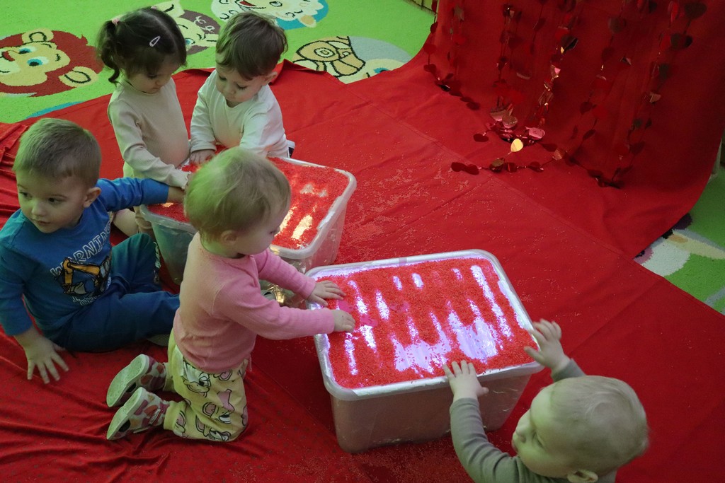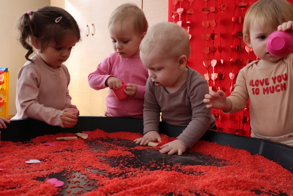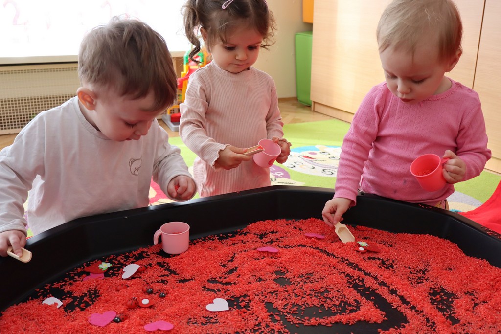 Dzieci z grupy Pszczółki ze Żłobka nr 1 obchodziły je 14 lutego. Z ogromnycm zaangażowaniem szukały serduszek ukrytych w czerwonym ryżu, naklejały serduszkowe naklejki na wycięte z papieru serca. Najbardziej podobało się dzieciom rysowanie paluszkami w ryżu wysypanym na podświetlone pudełka.