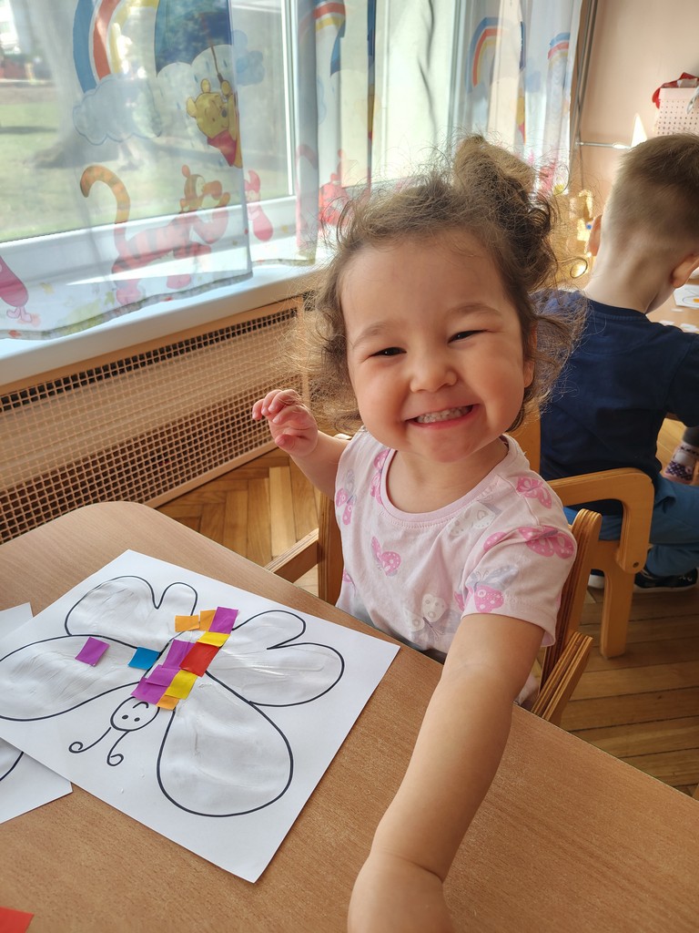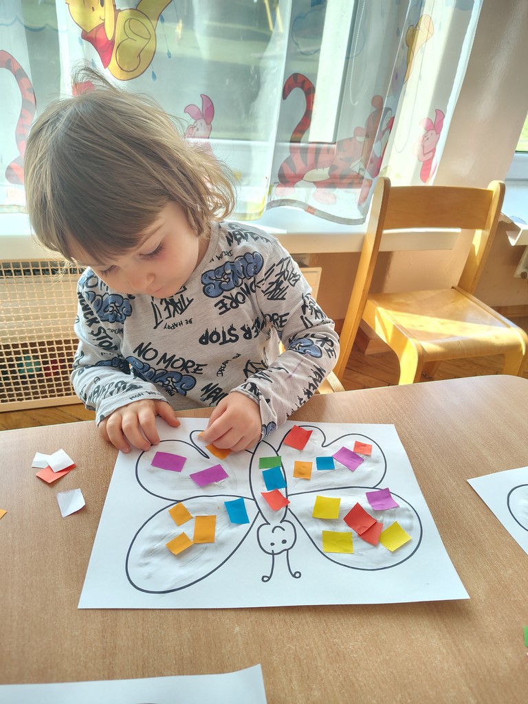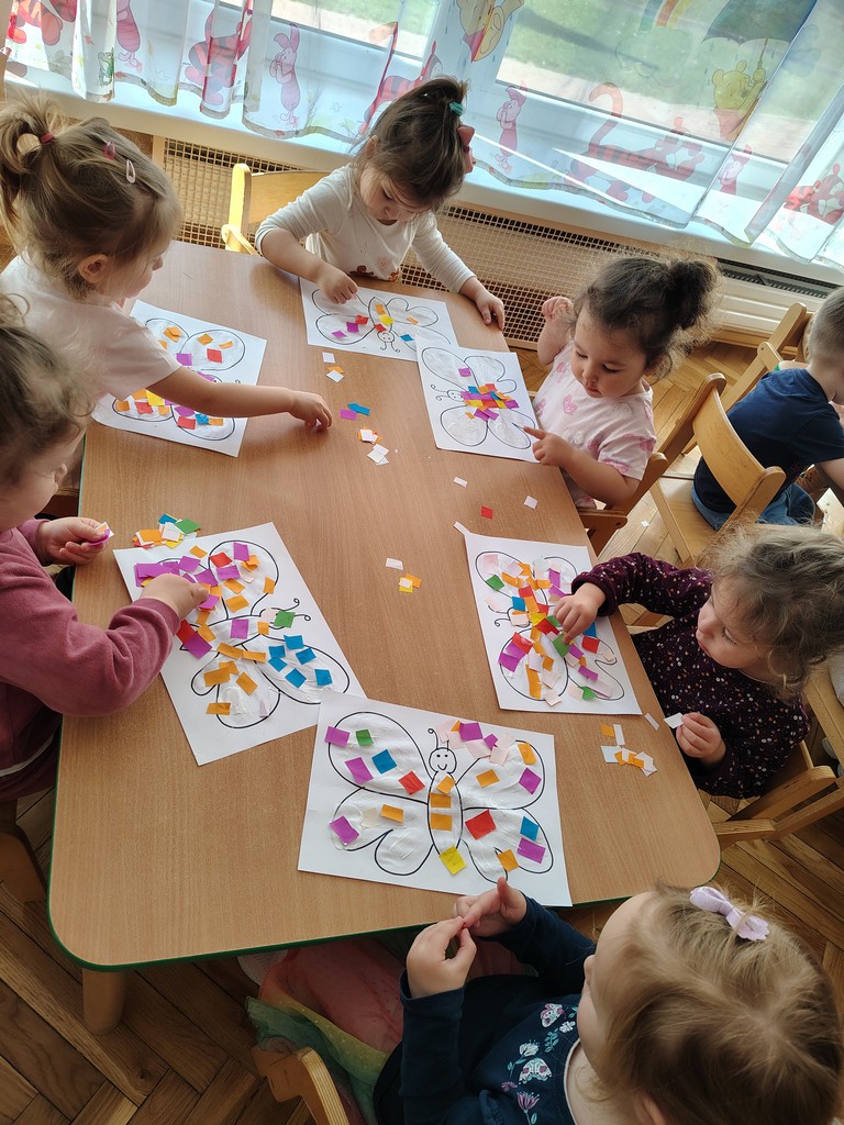 Dzieci z grupy Motylki Miejskiego Żłobka nr 1 w Gorlicach wykonały pracę plastyczną - wiosennego kolorowego motylka. Przyklejały na kartkę kawałeczki kolorowego papieru. Powstały piękne prace. Dzieci uwielbiają tego typu zajęcia. Rozwijają one wyobraźnię i zmysły oraz ćwiczą motorykę małą naszych Maluchów.