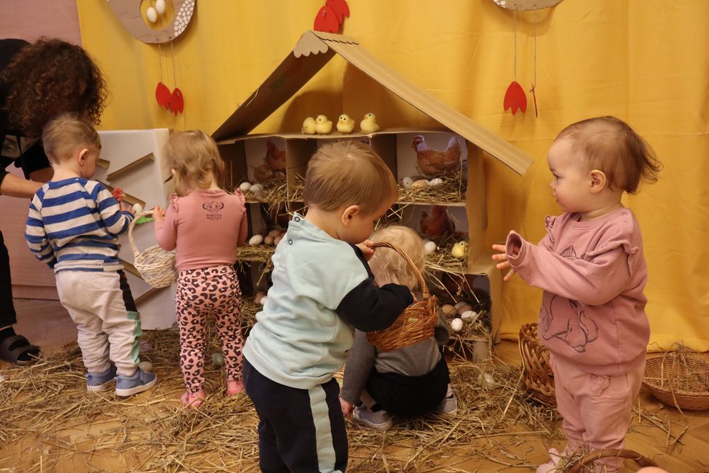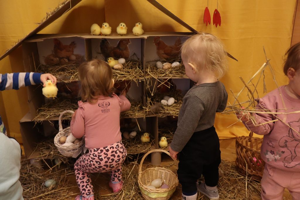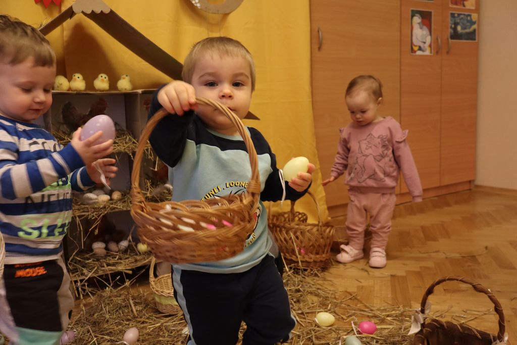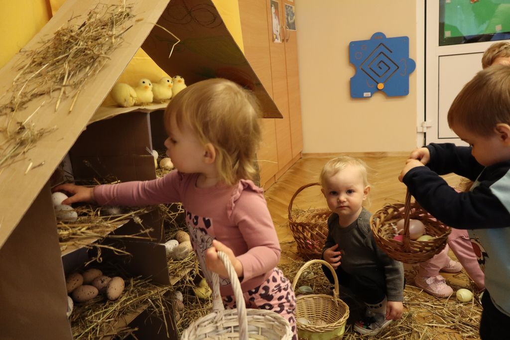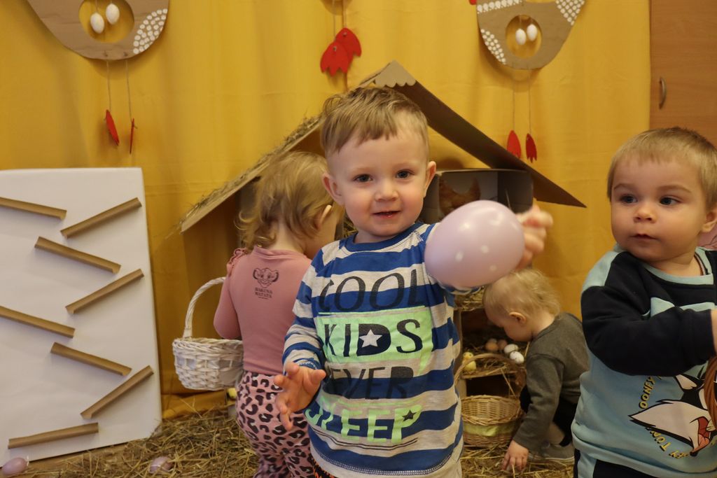 Dzieci z grupy „Pszczółki” zapoznawały się w ostatnim tygodniu z tematyką Świąt Wielkanocnych. Najmłodsi wyruszyli z koszyczkami z poszukiwaniu wielkanocnych jajeczek. W naszej sali ciocie przygotowały piękny kurnik z wykorzystaniem ekologicznych materiałów, a także tor po którym dzieci puszczały kolorowe jajeczka, ćwicząc motorykę małą i bawiąc się przy tym doskonale.