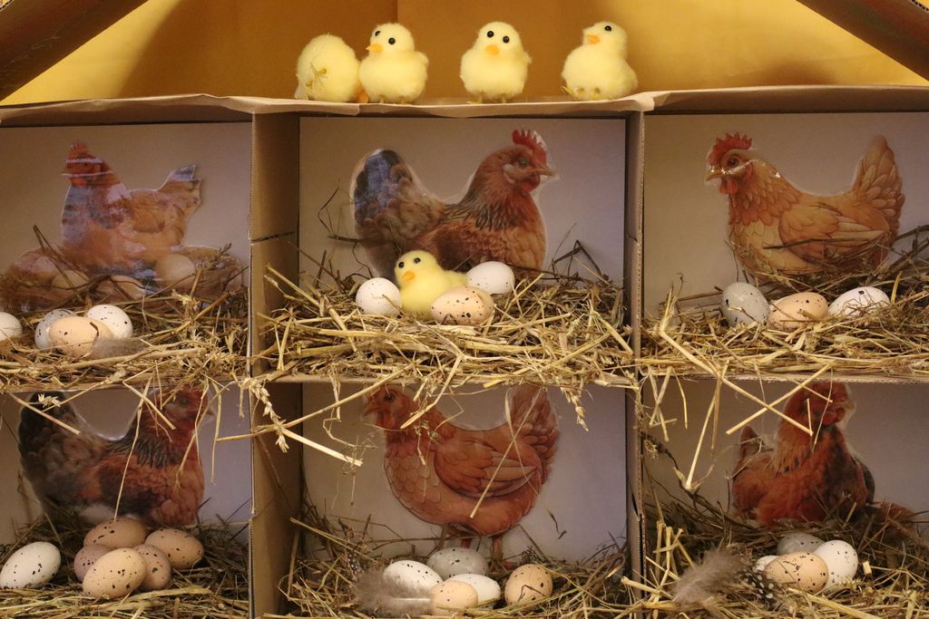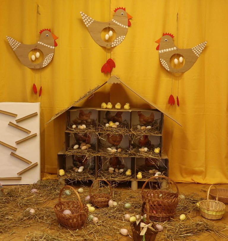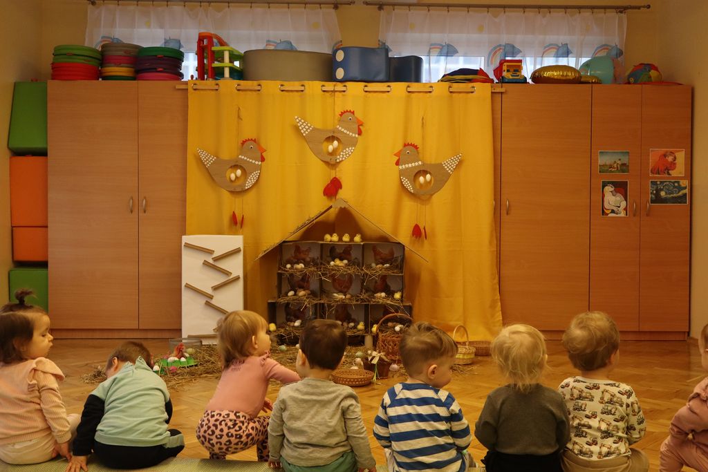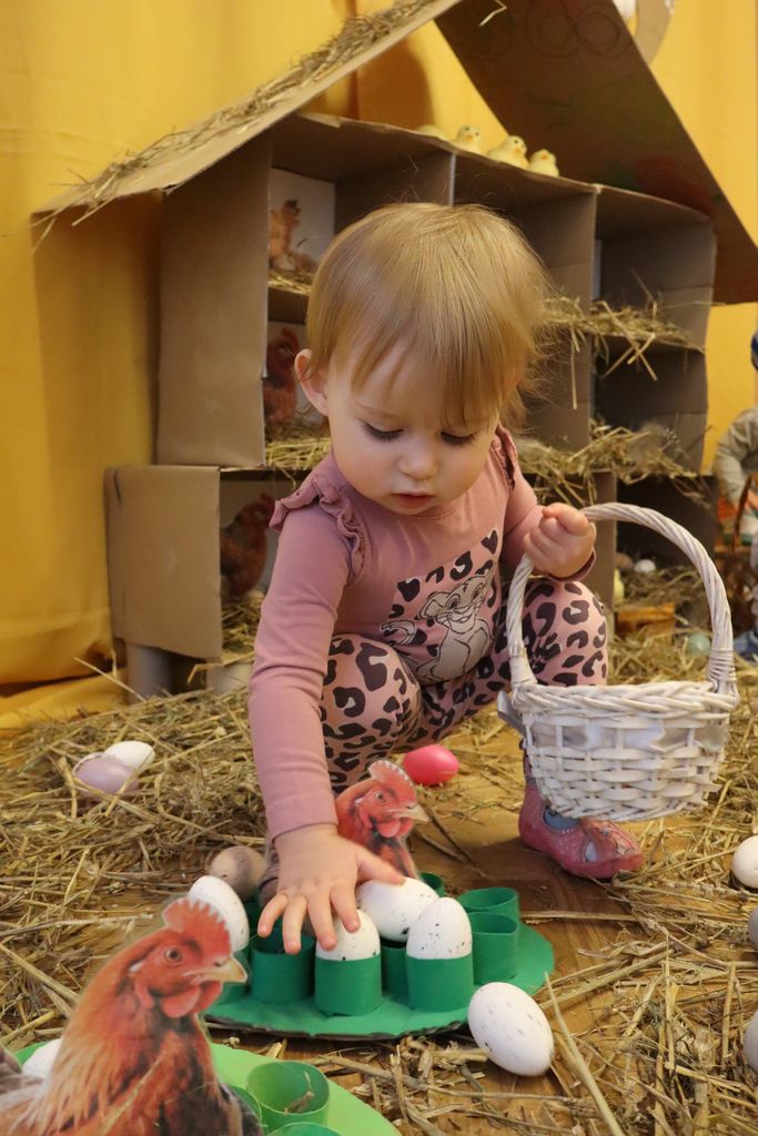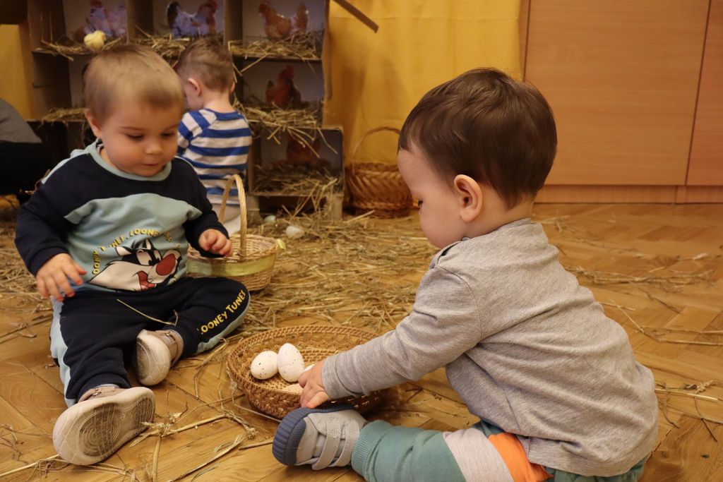Dzieci z grupy „Pszczółki” zapoznawały się w ostatnim tygodniu z tematyką Świąt Wielkanocnych. Najmłodsi wyruszyli z koszyczkami z poszukiwaniu wielkanocnych jajeczek. W naszej sali ciocie przygotowały piękny kurnik z wykorzystaniem ekologicznych materiałów, a także tor po którym dzieci puszczały kolorowe jajeczka, ćwicząc motorykę małą i bawiąc się przy tym doskonale.